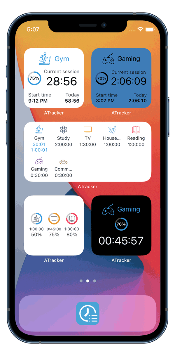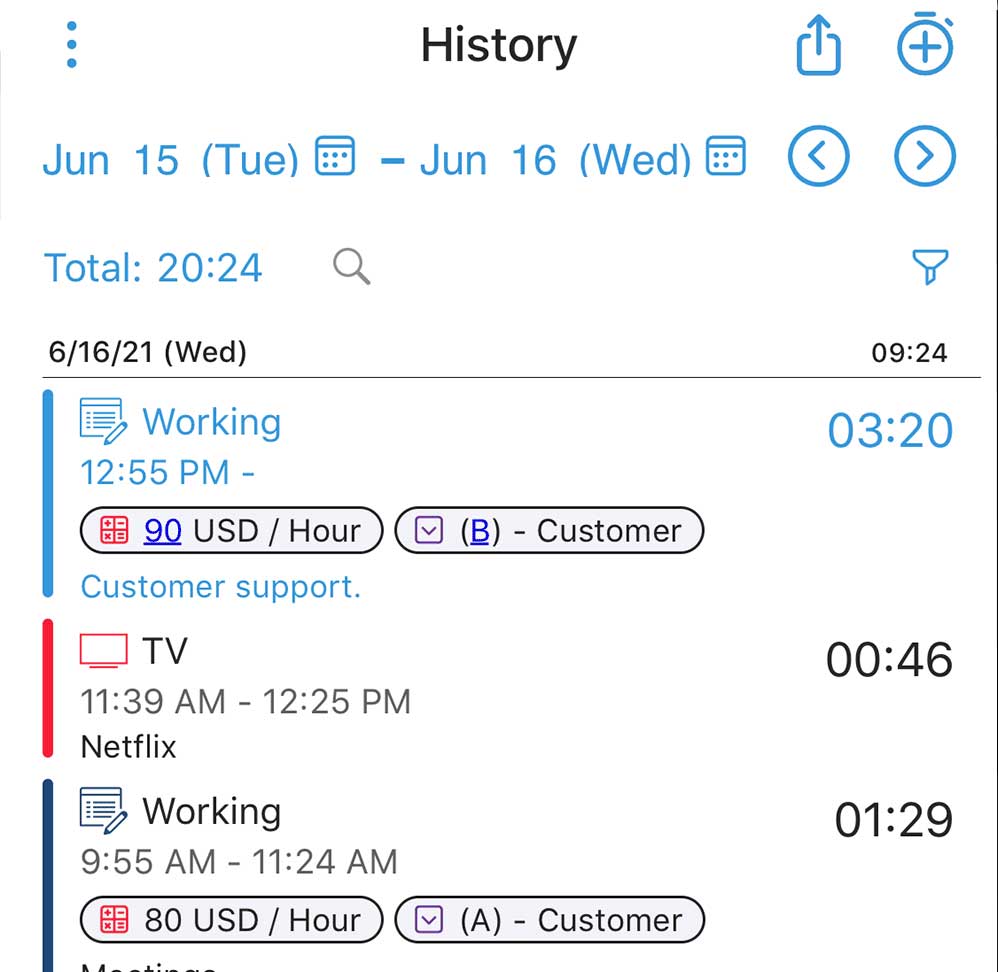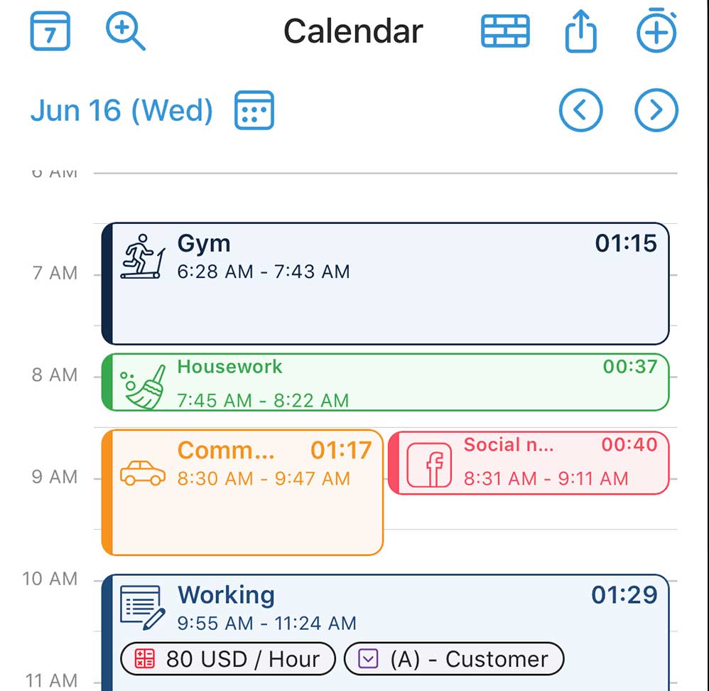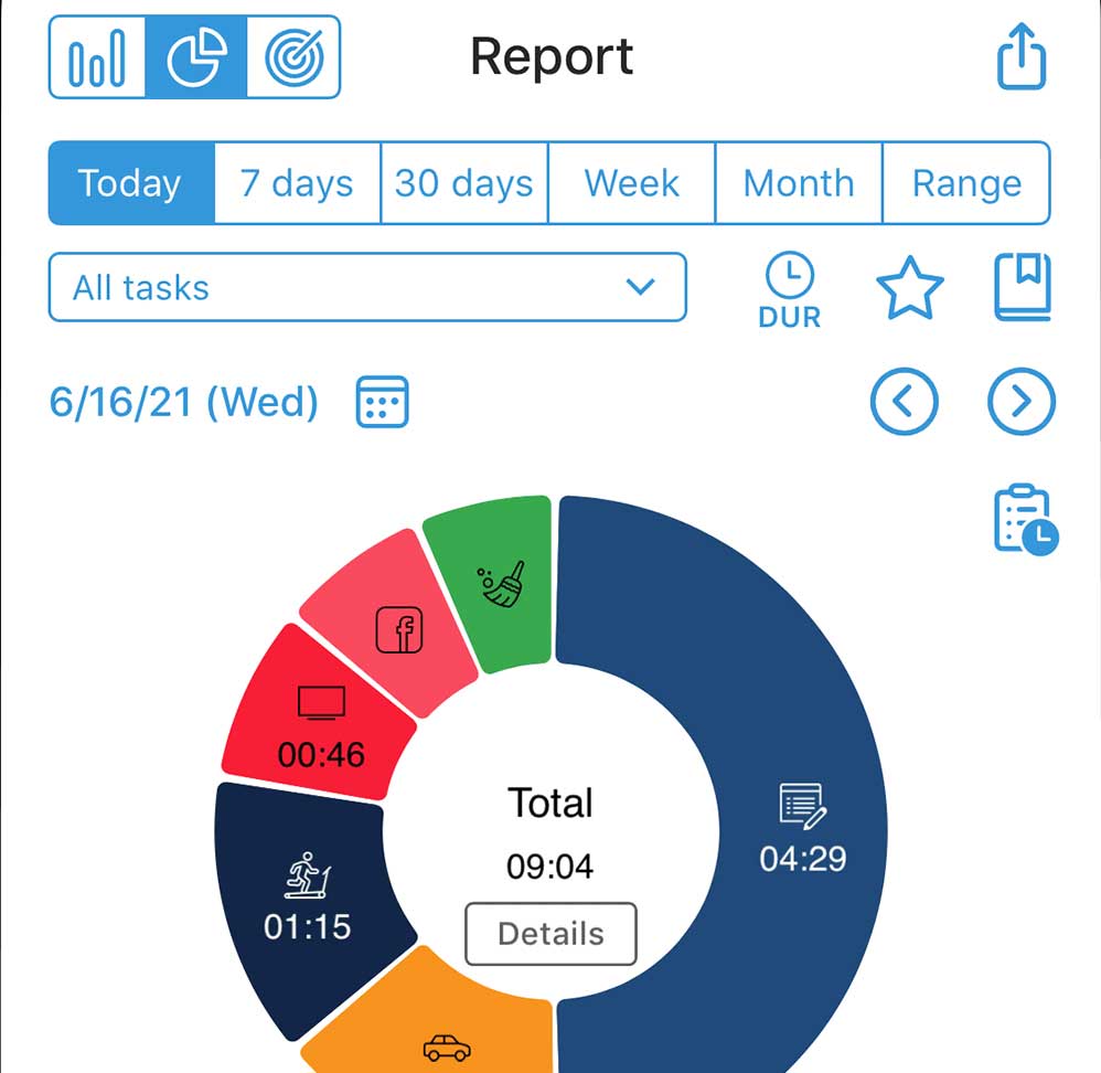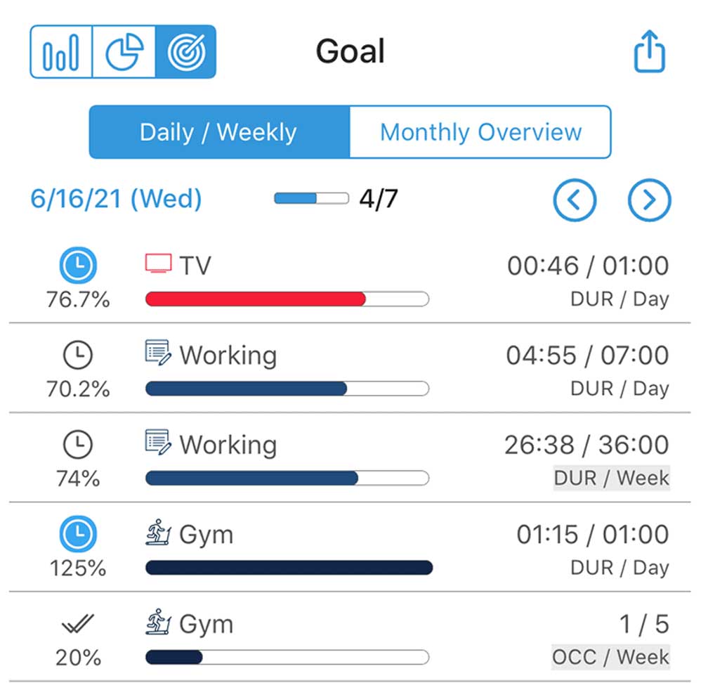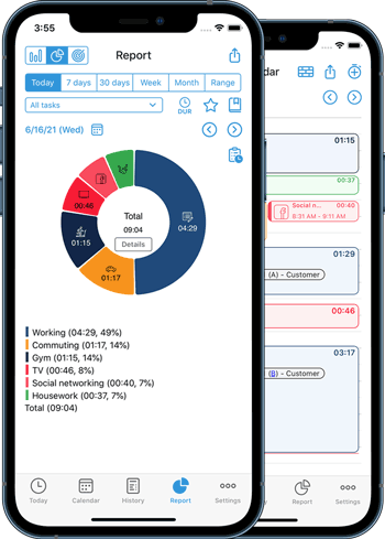 your day’s activities shows you at a glance where you spent most of your time. Set activity timers